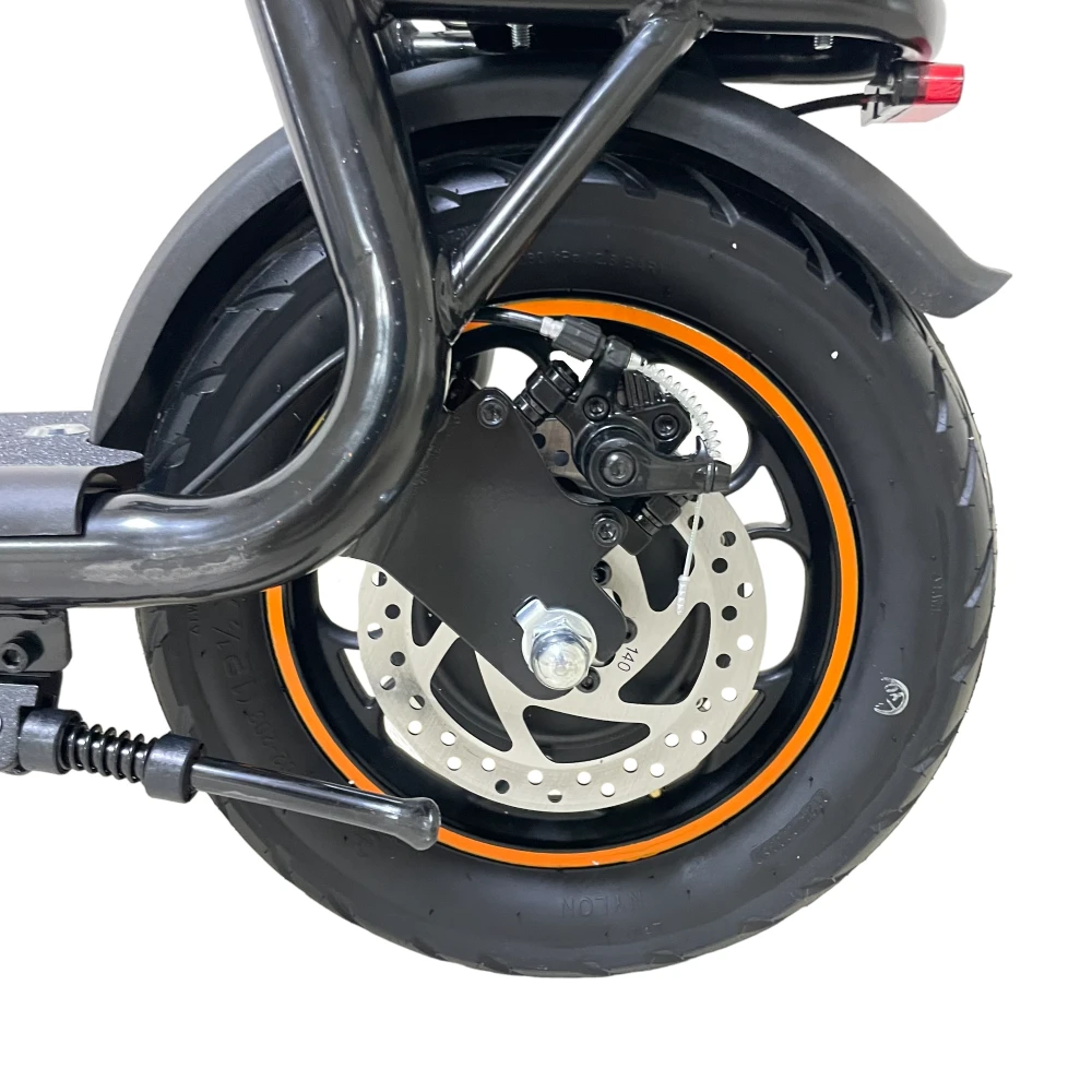 12‑дюймовые колёса + передний амортизатор обеспечивают плавность даже по неровной дороге. Влагозащита IP54 защищает от дождя.