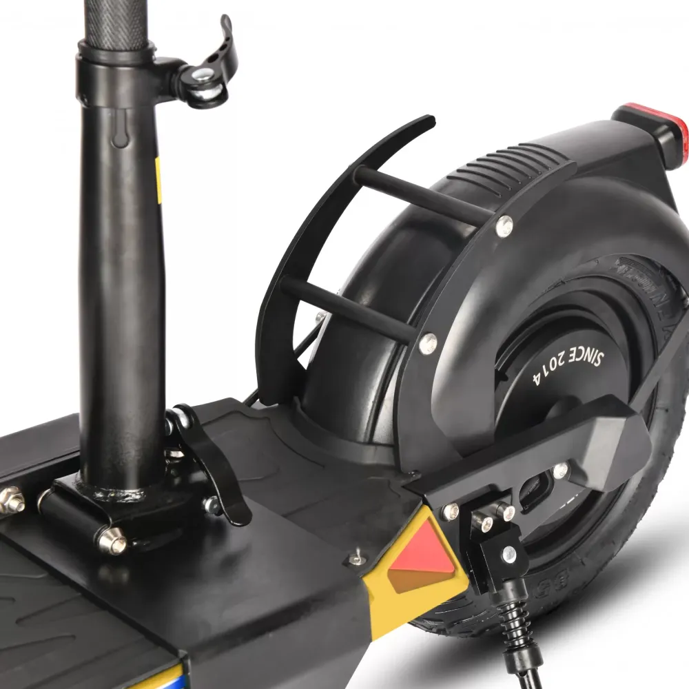 Большие колеса 11 дюймов изготовлены из резины и имеют надувную конструкцию. Широкий протектор обеспечивает лучшее сцепление с дорожным полотном. Амортизация доведена до совершенства и позволяет не замечать ямы и кочки. Широкое сидение рассчитано на длительные поездки. Яркий передний свет и оригинальные габаритные огни делают поездки безопасными. Тормоза дисковые имеют независимы друг от друга на каждом колесе и хорошо реагируют на команды. Современный боровой компьютер отображает основные параметры электросамоката, такие как скорость и уровень заряда.