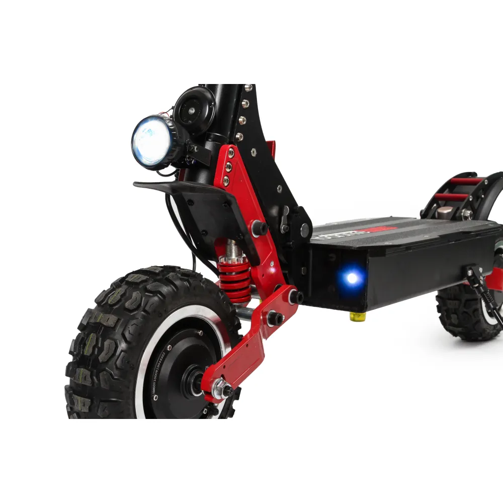 Повышенная проходимость агрегата порадует любителей загородных поездок. Он преодолевает подъемы в 45 градусов, подъемистый и резвый. Быстро набирает скорость, максимальные показатели которой составляют 60 км/ч. Полный привод способствует маневренности электросамоката. При спокойном передвижении можно отключить одно мотор-колесо.