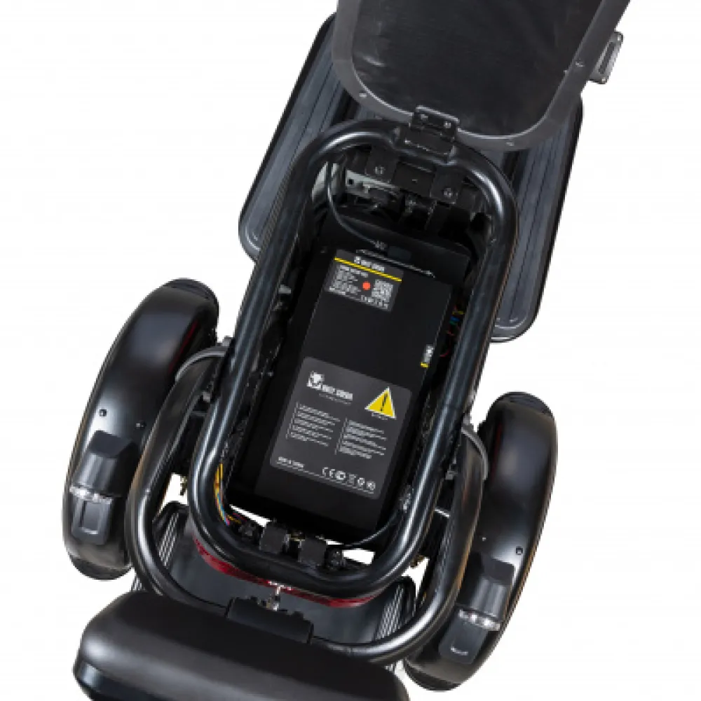 Модель оснащена емким АКБ, одной зарядки которого хватает на 60 км пути. Имеется возможность установки второй АКБ, способной продлить пробен до 100 км.