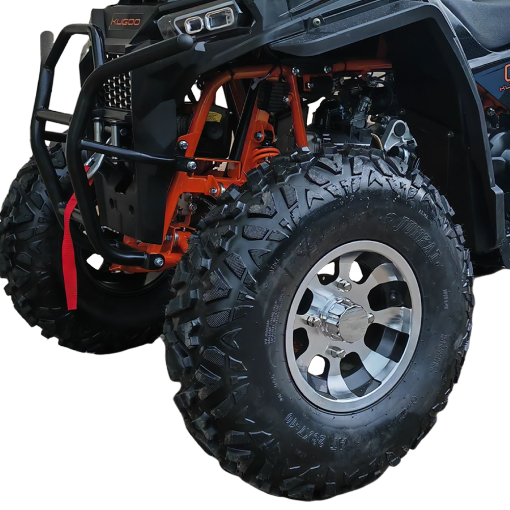 • Передние колёса 23 дюйма, задние 22 — для оптимального сцепления и амортизации на бездорожье.